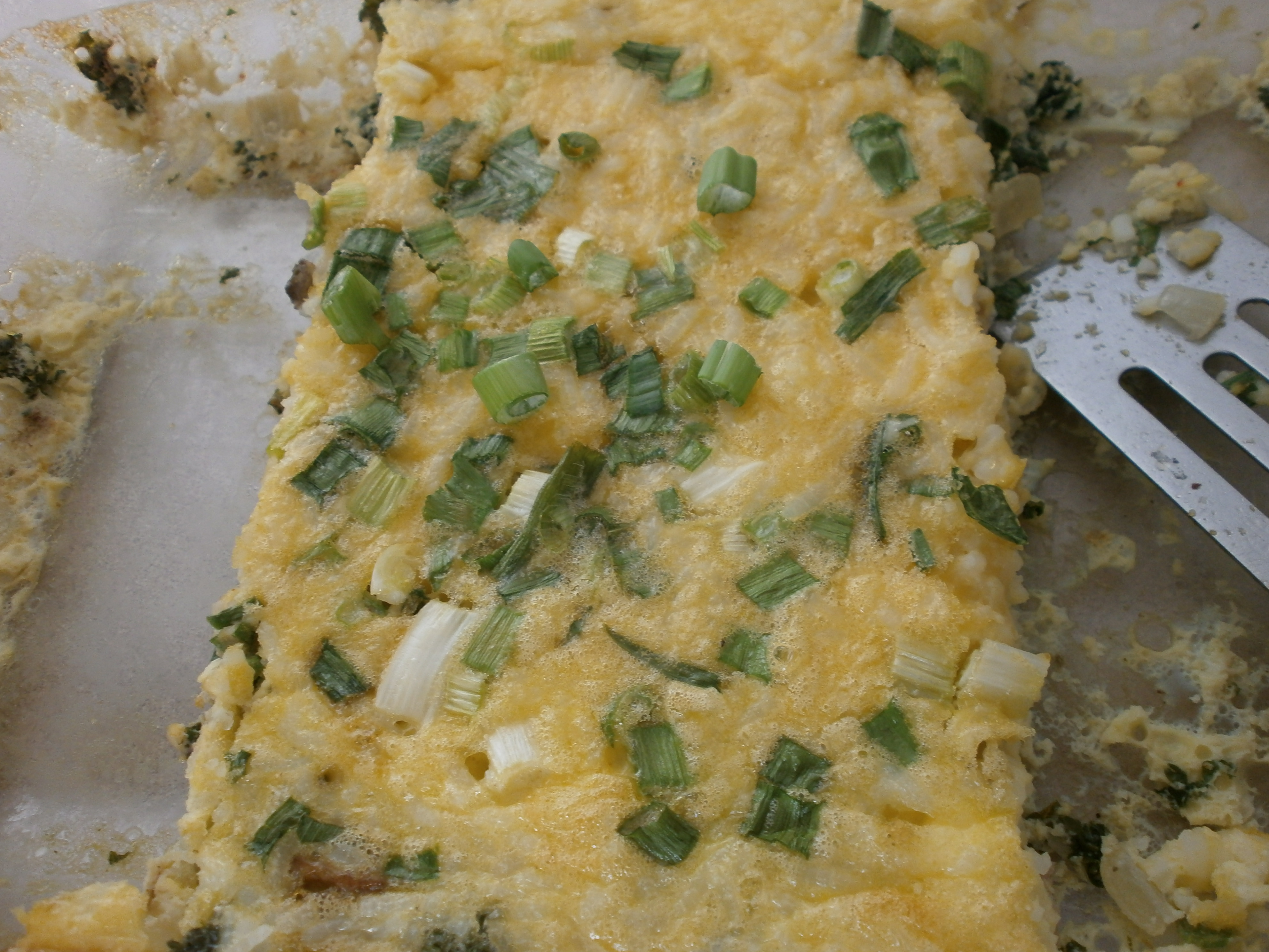 - Pour egg, mushroom (or meat) and rice mixture into the baking dish. Gently stir to evenly distribute ingredients. Top with chopped green onions.