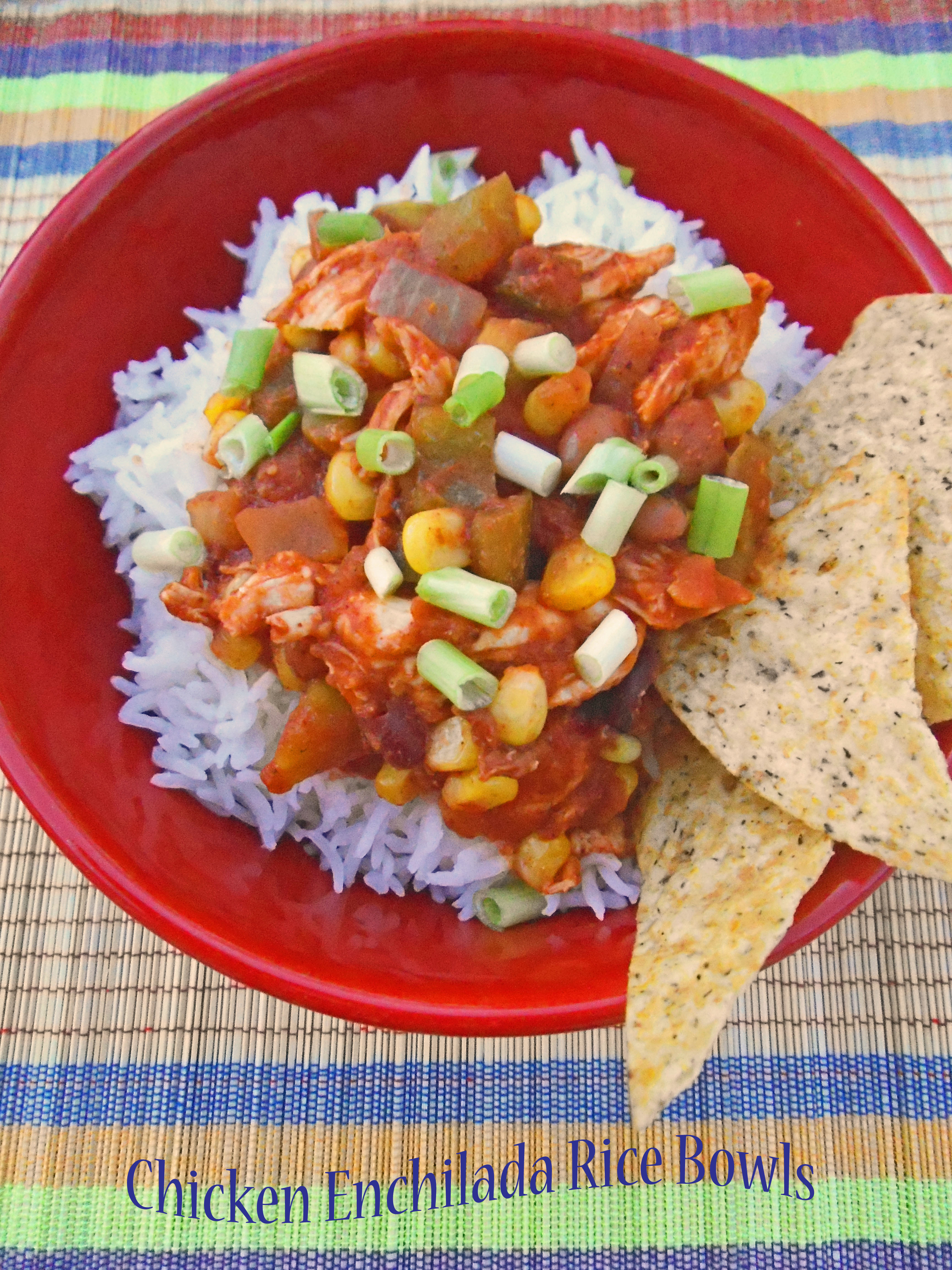 Another advantage of enchilada rice bowls is that they can be custom built to each person’s taste, too. Vegetarian? Leave out the chicken. Personally, I like my enchiladas creamy, so I might stir some mayonnaise into my sauce. Top with anything you like–olives, green onions, cilantro, or whatever you’ve got that appeals to your preferences.