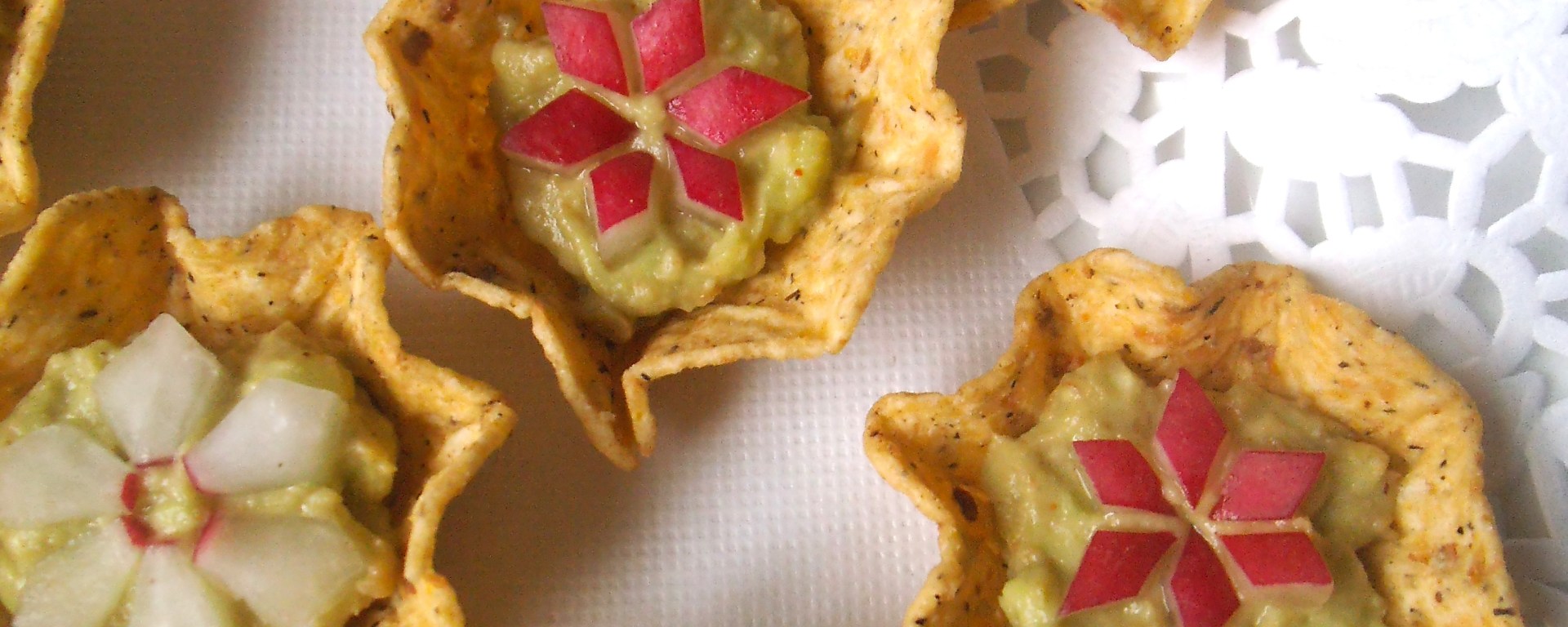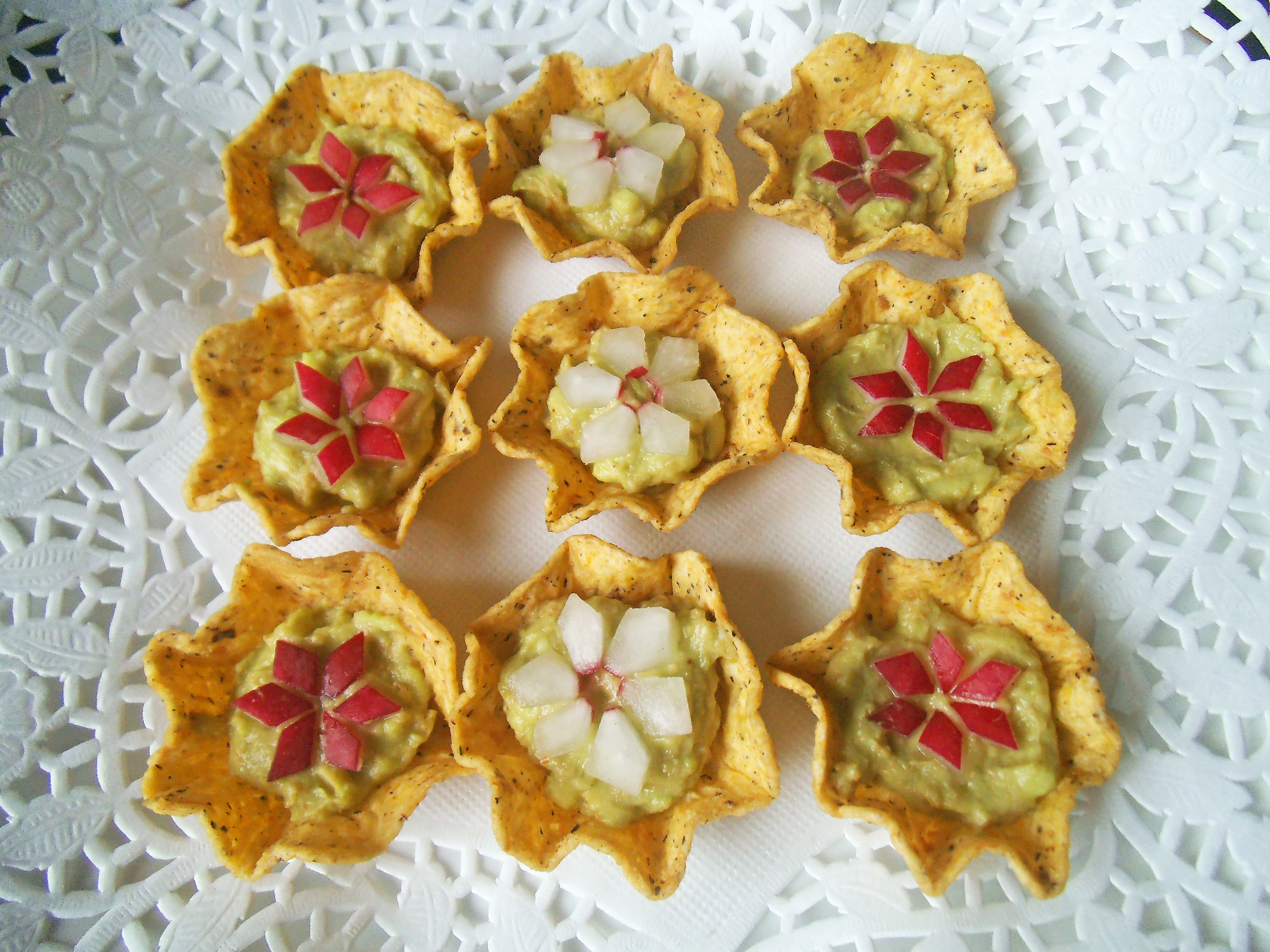 - Carefully assemble petals cut from radishes to form red and/or white poinsettia flowers on top of the guacamole.