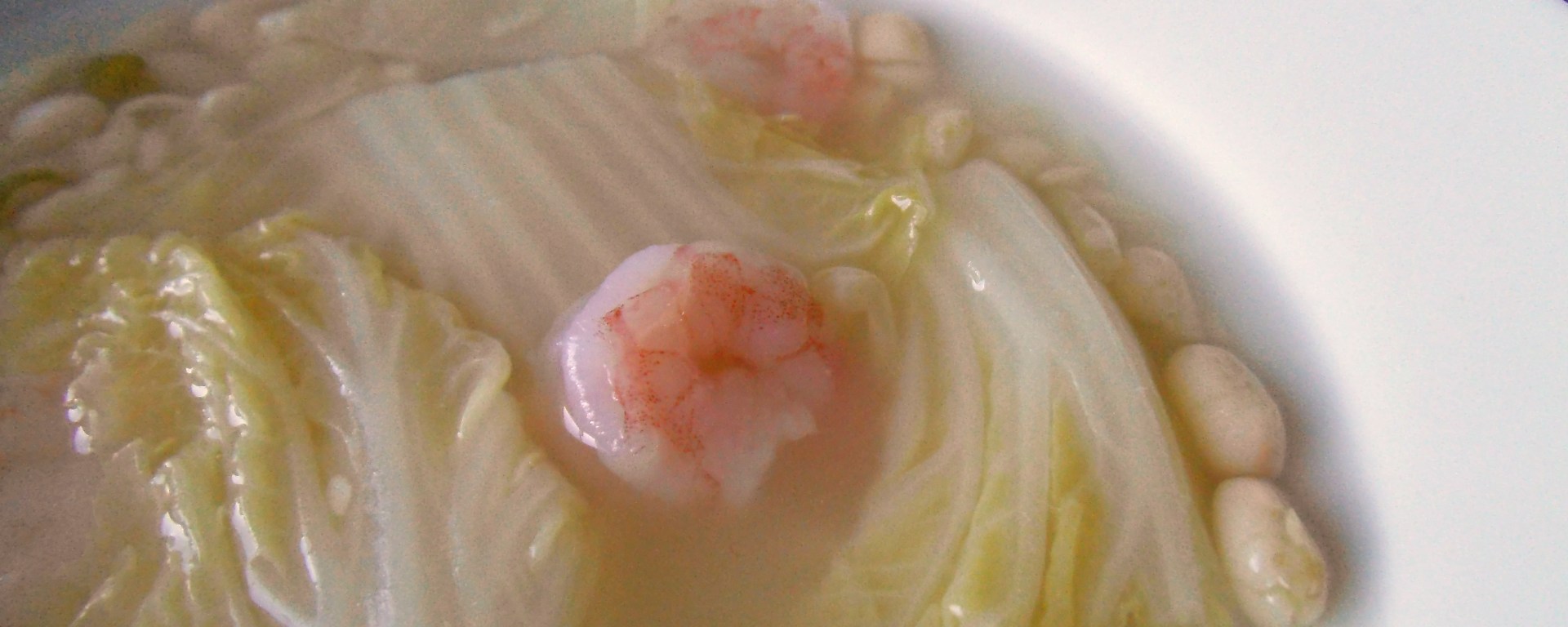 - Heat desired amount of broth to a gentle boil and add white beans and cabbage.Β Season with ginger or Italian herbs.Β Simmer for 10 minutes or until cabbage wilts.Β Add green onions and shrimp.Β If you use raw shrimp, make sure that it simmers long enough to cook the shrimp, which should only take a few minutes.Β Season with sea salt and/or black pepper to taste.