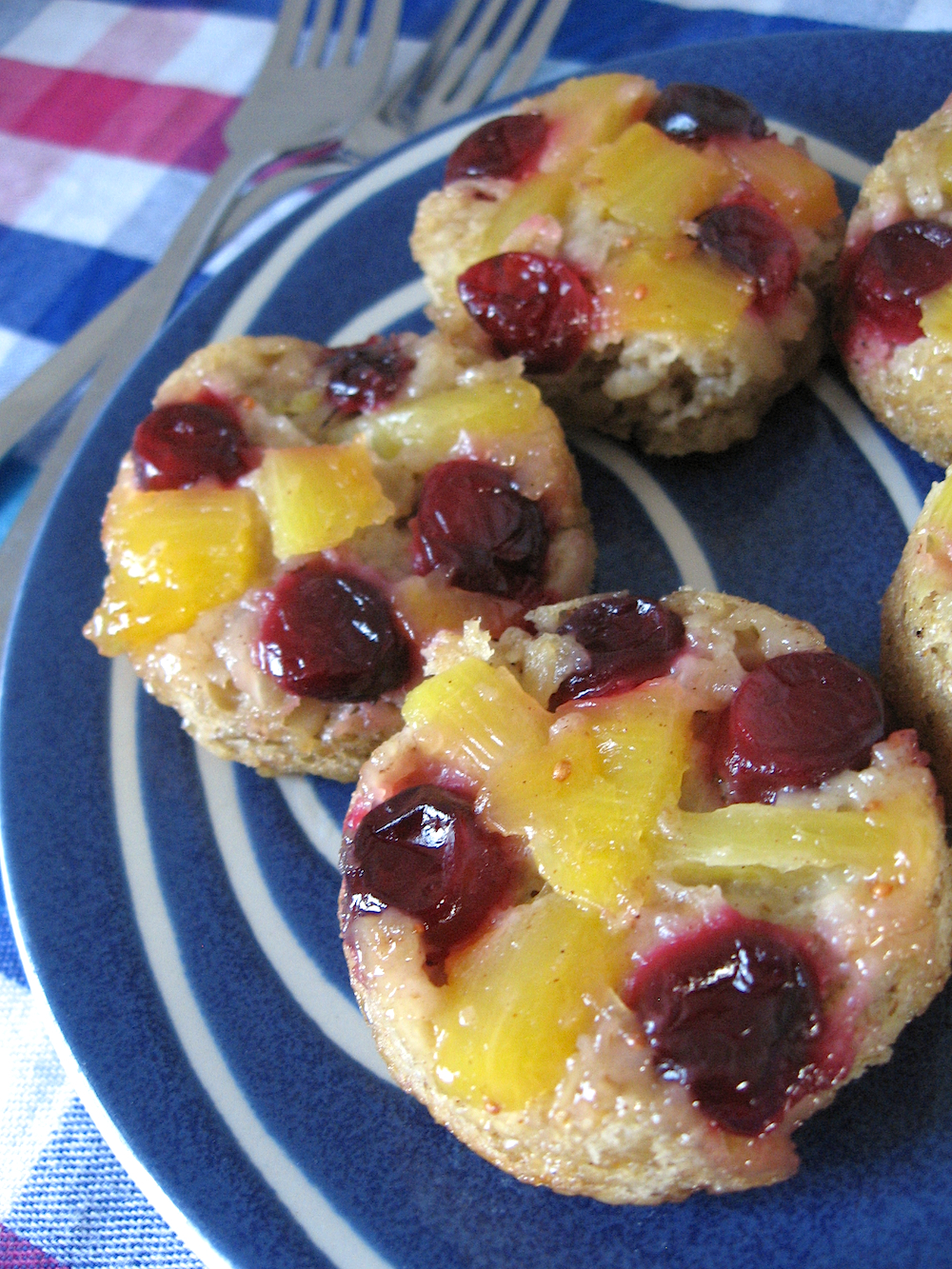 - Line muffin tin compartments with paper liners and grease the bottoms of the liners well. Place 4 cranberry halves in each cup, followed by some pineapple pieces to form a fruit layer. (Or to save time you can fold in the fruit with the batter in the bowl just before baking. The result will taste the same, but you will not achieve the upside-down effect.)