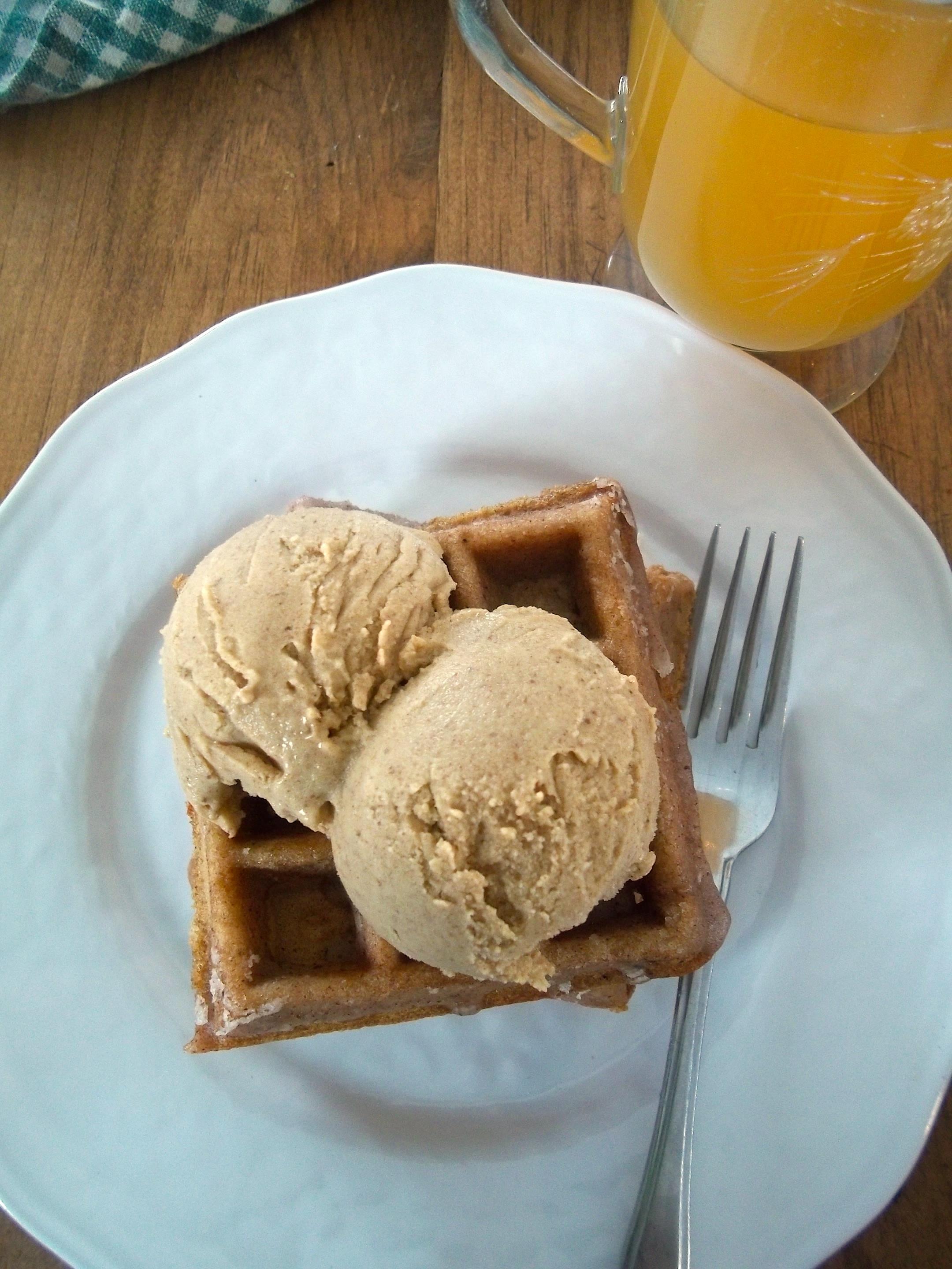 We enjoyed our apple cider waffles for brunch, with a side of crisp bacon strips. I added some Pumpkin Spice Ice Cream as a topping to my double stack, which made the glaze less necessary. If you prefer syrup to glaze, I recommend trying some cinnamon maple syrup to accent the spice blend in the waffles. Or if you really want the apple cider flavour every which way, you can reduce 2 cups of cider on the stove until it thickens into 100% cider syrup.