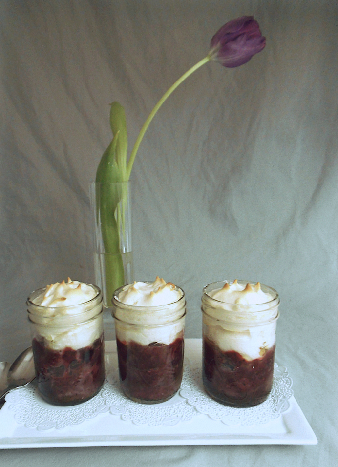 - Layer cherry filling over chocolate banana cake, until each jar is 2/3 full. Add a meringue layer to fill the jar (this will rise when hot and then shrink back when cooler). Bake the jars for about 10 minutes, until meringue turns light golden brown. Let jars cool before serving slightly warm or at room temperature.