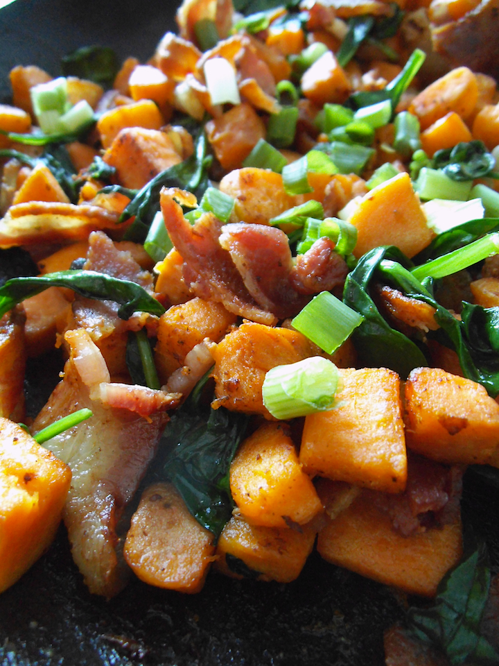 Sweet Potato Skillet with Bacon and Greens {Paleo}