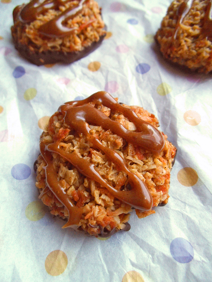 Will you like them better than the original boxed cookies?  There is but one way to find out.  Or maybe there’s more than one, since the caramel and chocolate can be customized to your liking. Healthier Samoa Coconut Cookies My preferred version of these coconut cookies is actually with extra caramel and without the chocolate dip.  But I am a little unusual in my take-it-or-leave-it attitude toward chocolate.  Perhaps you consider chocolate a necessary component.  If so, by all means, dip and enjoy!