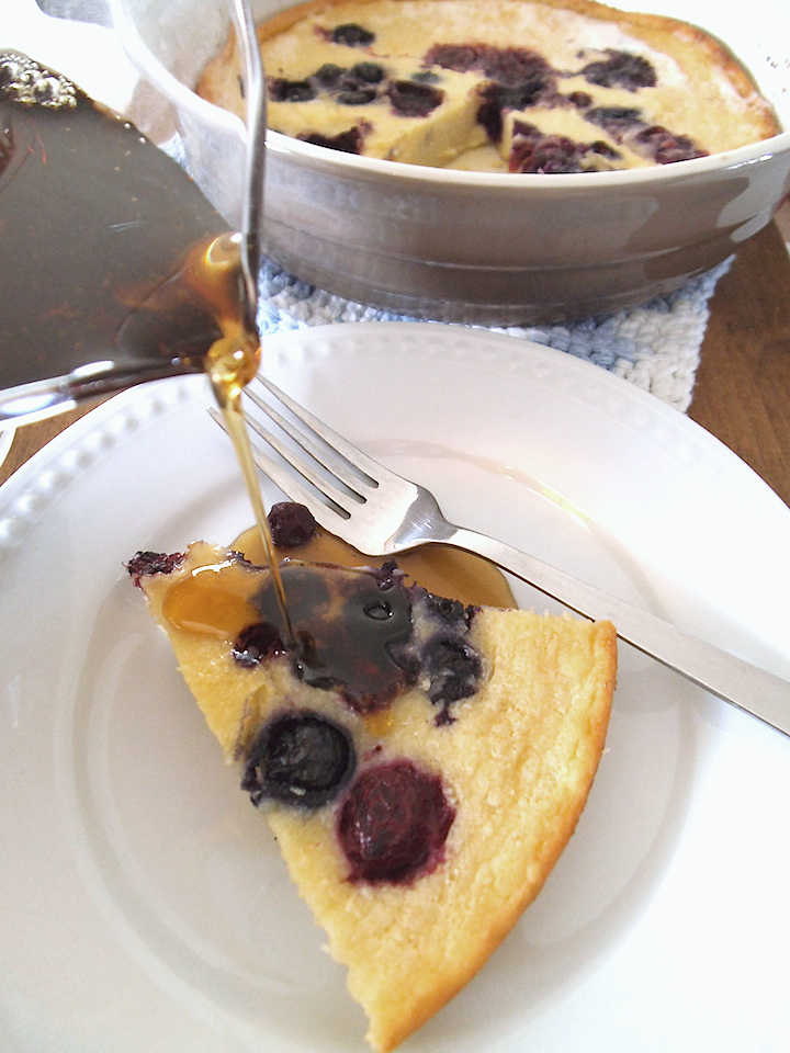 I usually wake up hungry. But pancakes seem like a little too much work sometimes because they have to be monitored and flipped. Not so with an oven pancake. Your one dish or skillet slides into the oven and you are free until the pancake is done baking. A slice of warm berry lemon pancake tastes wonderful with maple syrup, which counterbalances the tart fruit flavours inside.