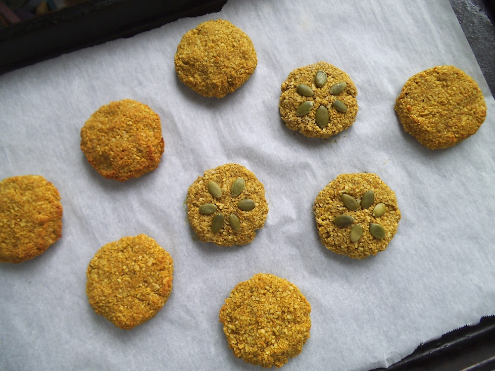 A few of the cookies became five-ingredient cookies because I thought it would be fun to top them with pepitas (raw pumpkin seeds).  Pretty like a daisy, aren’t they?  Another bonus to this vegan recipe is that you can eat the dough without worry.  It is egg-free and is essentially a baked variation of Instant Banana Coconut Grain-Free “Oatmeal.”  And of course you need to taste the dough as you go, to make sure you get the spices exactly how you like them.Banana Coconut Spice Cookies with Turmeric {4-ingredient recipe} | Swirls and Spice