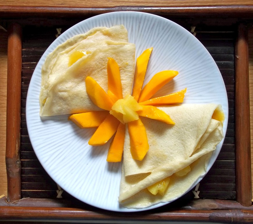 Like noodle soup, I view crepes as another deliciously versatile dish that can be enjoyed any time of day (or night). Crepes disappear faster that hotcakes in our house, so I always try to double or triple the crepe recipe. In one sitting a crepe fanatic like myself can devour anywhere from 6 to 12 crepes. This recipe makes about a dozen. If you ever … Continue reading Sunshine Crepes with Mango and Pineapple